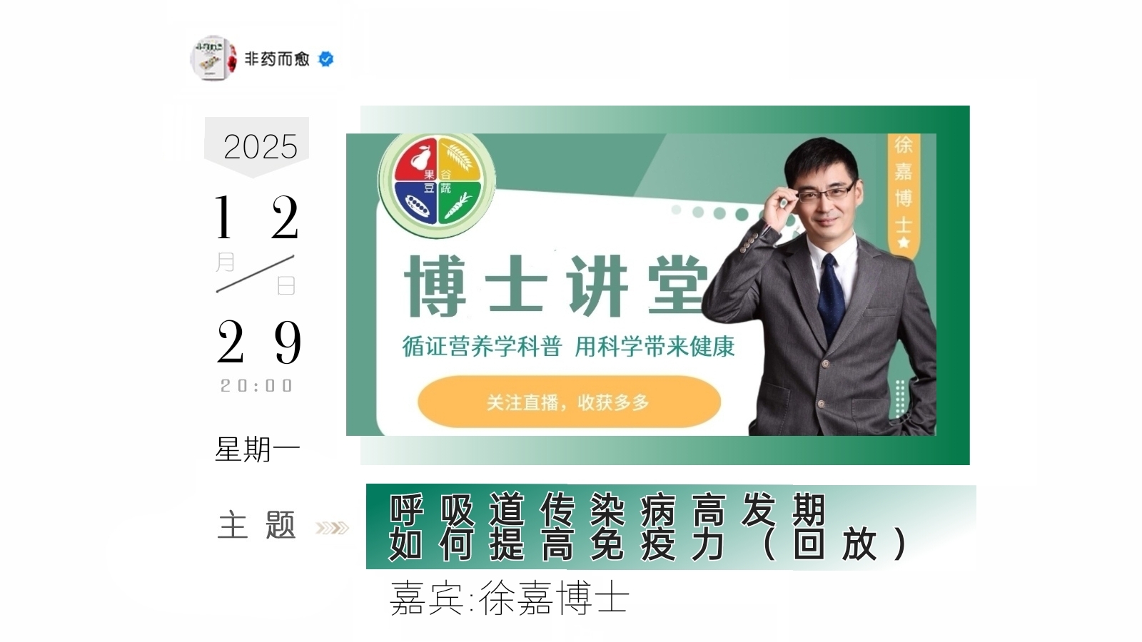 博士讲堂: 呼吸道传染病高发期如何提高免疫力(回放) 嘉宾:徐嘉博士 2025.12.29